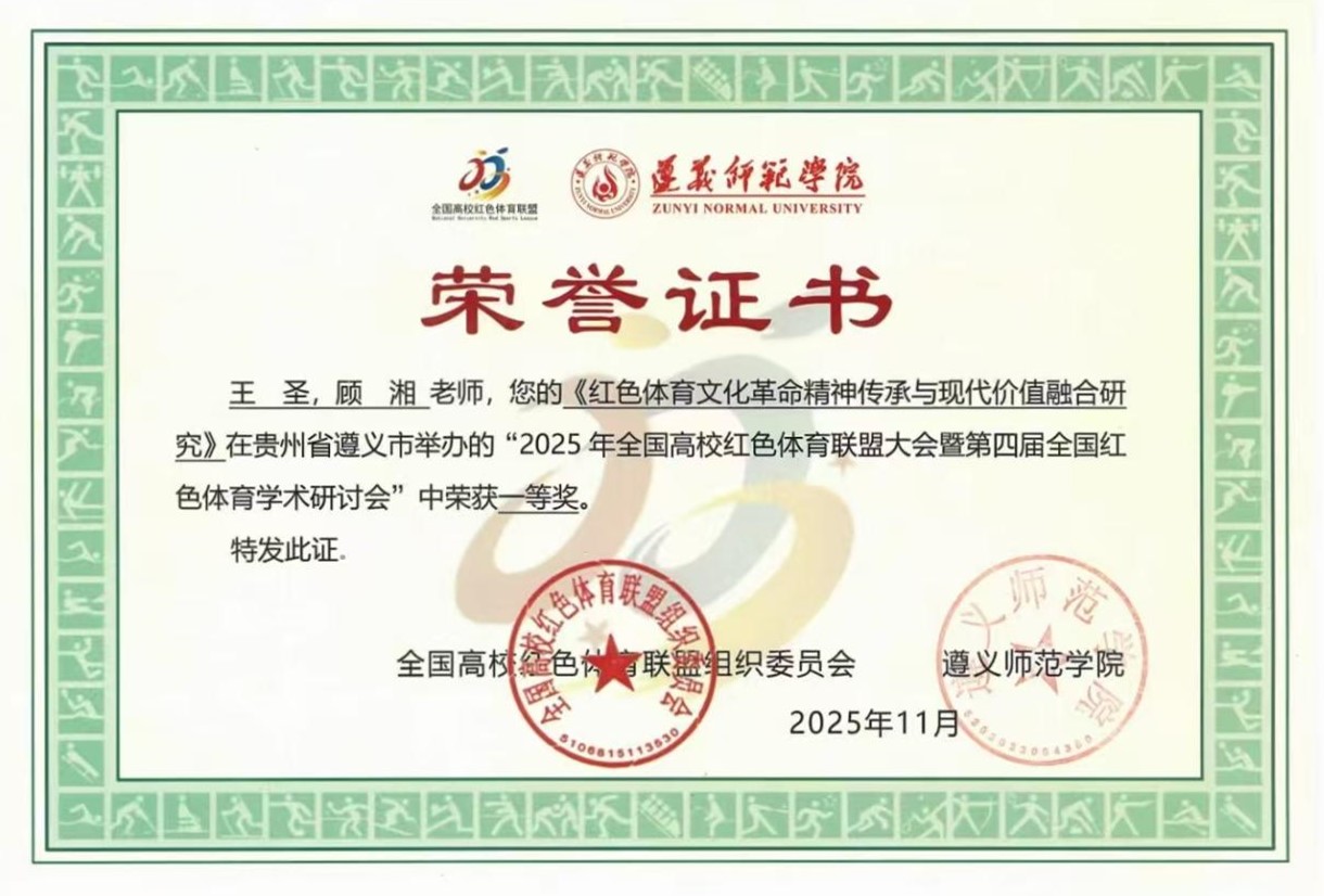 近日,全国高校红色体育联盟大会暨第四届全国红色体育学术研讨会在遵义师范学院召开。3044am永利官网王圣博士受邀参会,他以《红色体育文化革命精神传承与现代价值融合研究》为题,在此次研讨会上作专题报告并荣获一等奖,成为学院深化红色育人实践的重要成果。